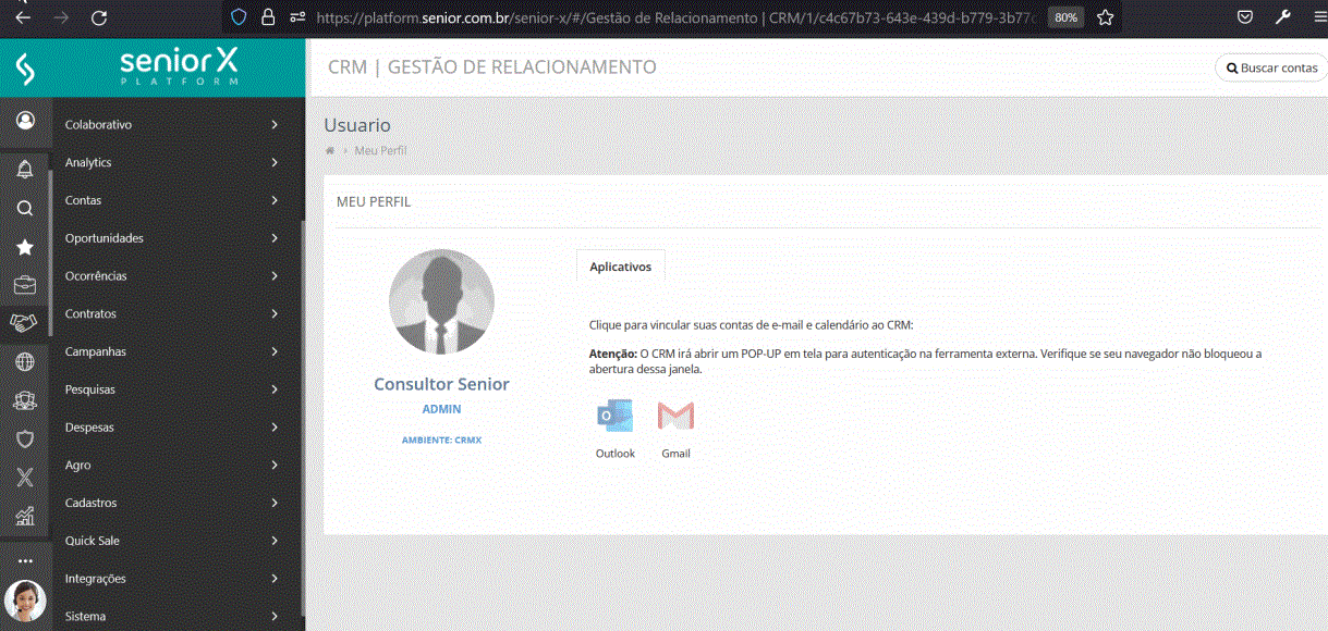 Acceda al menú Principal > Sistema > Mis aplicaciones y seleccione la plataforma deseada para la integración, Gmail o Outlook. El integrador solicitará el inicio de sesión y los permisos necesarios para la plataforma de email, los cuales deberán ser aceptados para poder realizar la integración.