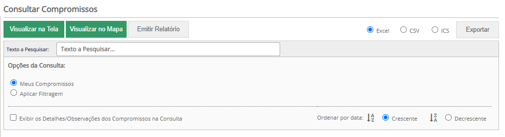 Para definir las informaciones presentadas en el informe, aplique un filtro en las pantallas de consulta de cada módulo, informando qué opciones serán necesarias en el informe.