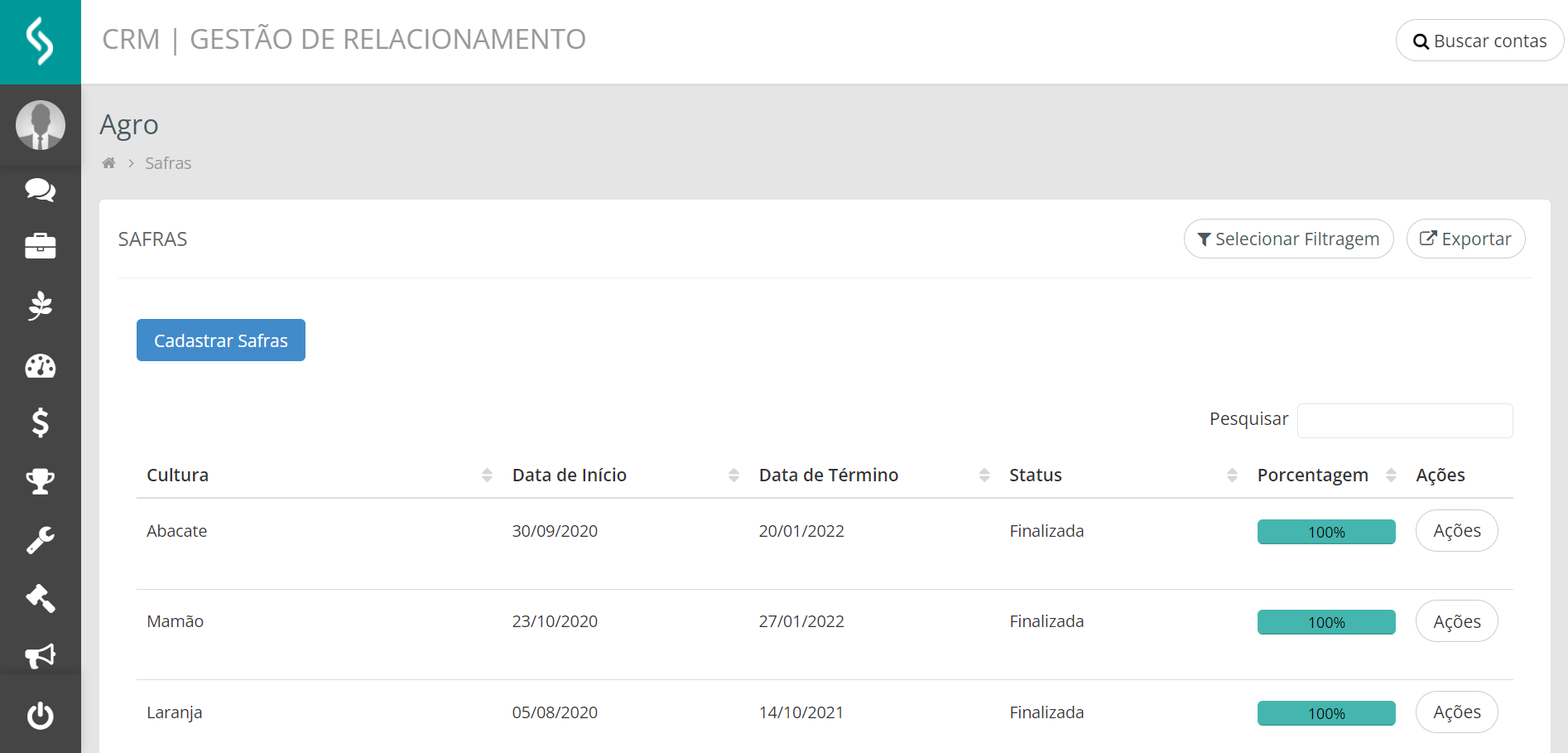 En el Gestión de Relaciones | CRM es posible informar cual el cultivo (producto agrícola), el período inicial y final de la cosecha, así como si ya concluyó o está en curso. En los casos en que la cosecha esté "en curso", es posible consultar su porcentaje de conclusión.