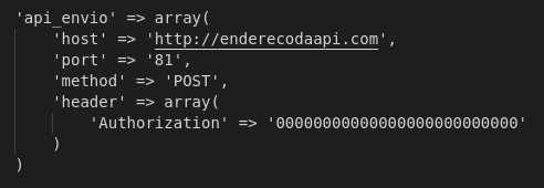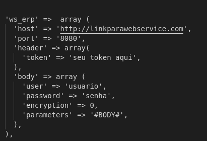 - cuerpo: aformación con una plantilla de cuerpo predeterminada para las solicitudes, en la que el índice debe contener un valor "#CUERPO#"que será reemplazado por el cuerpo de requisición generado por el Integrador y funciona como si fuera una cobertura de envío para todas las requisiciones.