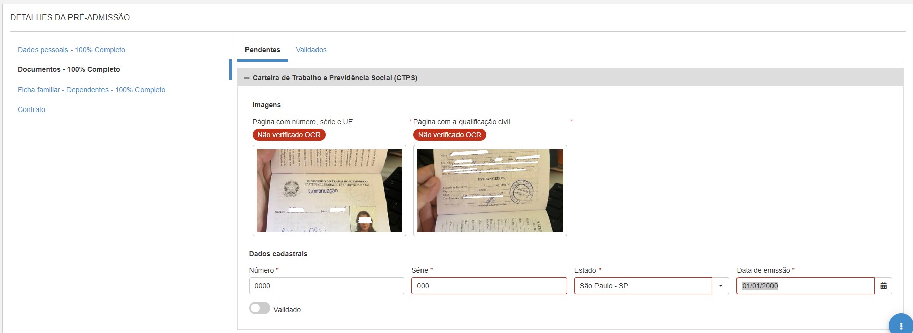 Cuando el nuevo empleado guarda su información, RR.HH. puede verla en la pantalla de inicio de sesión.Preadmisiones > pestañaBajo validación antes de finalizar el proceso. Esta validación también incluye la función OCR, que verifica automáticamente para RR.HH. si la información completada por el empleado coincide con los documentos que envió.