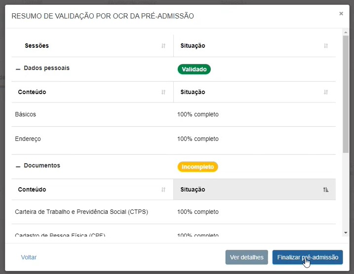 Haga clic en los porcentajes en la columna Validación OCR o en el botónComportamiento > La opción Detalle abrirá la ventanaResumen de validación de OCR previo a la admisión. En esta ventana se mostrará toda la información validada exitosamente y su porcentaje de completitud; así como aquellos que necesitan ser evaluados por RR.HH., es decir, que tienen el estatusIncompleto: