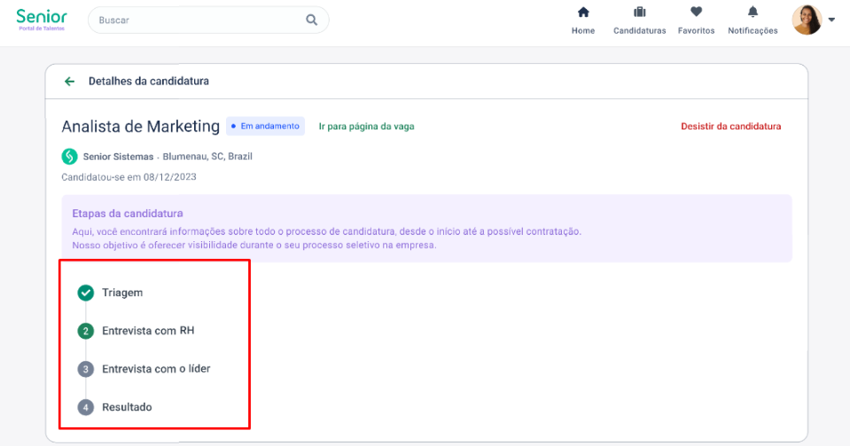 Outras ações, como o registro de parecer, comentários e envio de exame médico, não alteram o status do candidato no Portal de Talentos Senior. Somente a movimentação entre etapas visíveis altera o status.