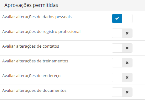 Para os papéis definidos como RH, devem ser indicados os itens que este pode aprovar no processo de atualização cadastral: