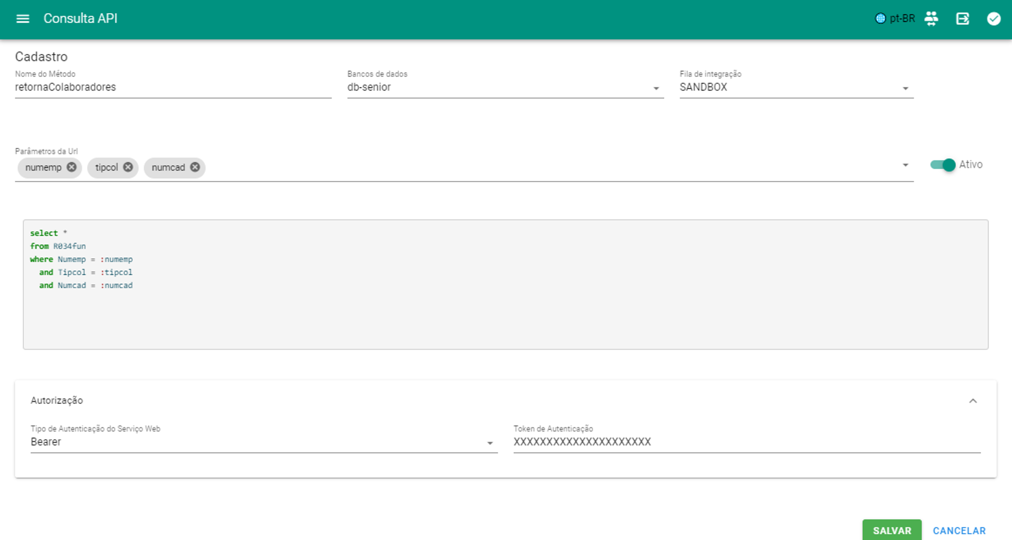 - Token de autenticación: Token o Credencial que se asociará con el tipo de autorización del servicio web.