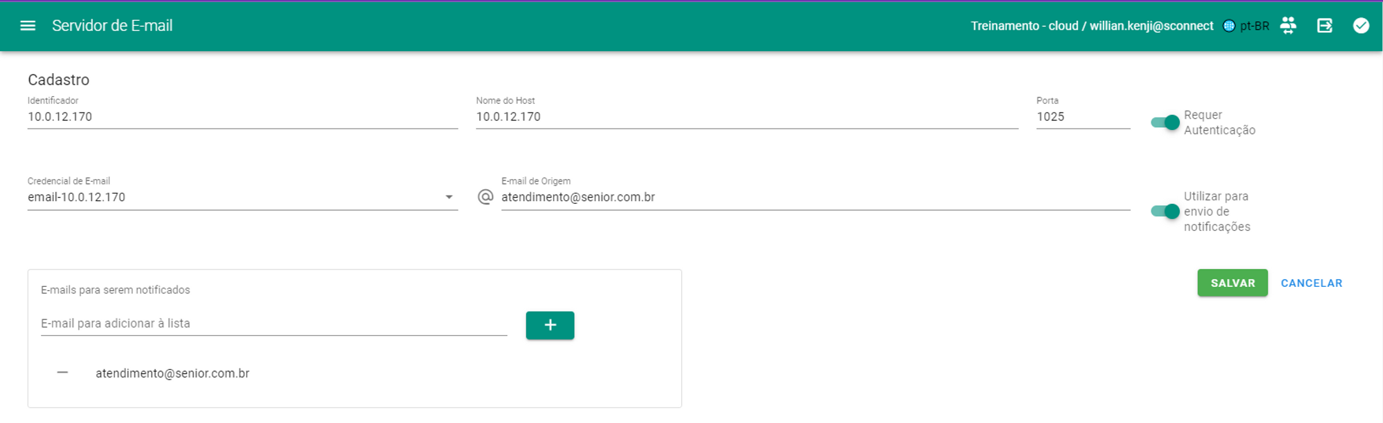 Permite el registro del servidorSMTP, para uso en flujos de integración, entre las funciones disponibles se encuentran mensajes a través de acciones dedicadas. Cada servidor de correo electrónico también puede utilizarse como notificador de la plataforma, permitiendo así enviar un mensaje cuando se alcanza el número máximo de fallos, determinado por el usuario.