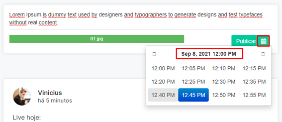 Al lado del botón Publicar, tiene el botón con un icono de calendario, al hacer clic en él, el usuario puede programar una fecha/hora en que la publicación aparecerá en la línea de tiempo.