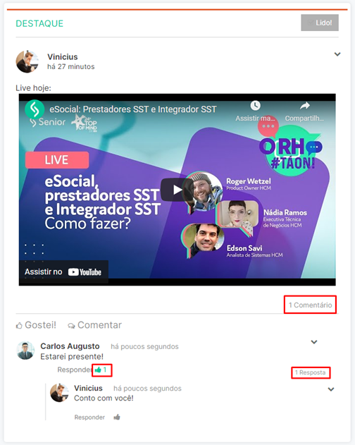 En los comentarios también está la opción de me gusta, vista de me gusta por comentario y respuesta, donde al hacer clic en el botón de respuesta el usuario responde a un comentario en particular.