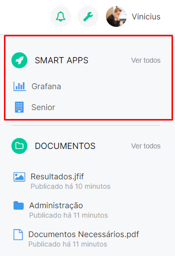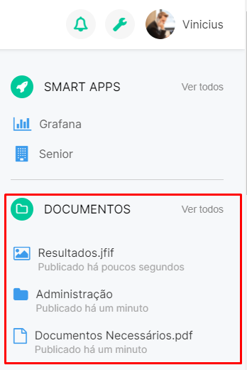 Este menú sirve como acceso directo a la herramienta ECM GED también disponible en la Plataforma Senior X, al hacer clic el usuario será redirigido a la pantalla principal de la herramienta. En el lado de Social Studio, también puede ver los últimos documentos que se cargaron o cambiaron en el GED. Recordando que los documentos se listan de acuerdo a los permisos que tiene el usuario, pudiendo ver solo aquellos que tiene acceso.