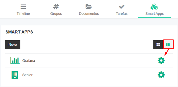 Para editar una aplicación ya registrada, haga clic en el icono en forma de lista en la página de lista. Al hacer clic en el icono, un botón con forma de engranaje estará disponible.