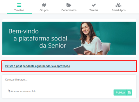 Siempre que haya alguna publicación pendiente, se enviará una notificación a los administradores y moderadores, además de un mensaje en la parte superior de la línea de tiempo como en la imagen a continuación: