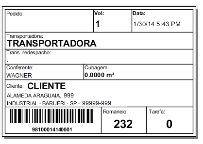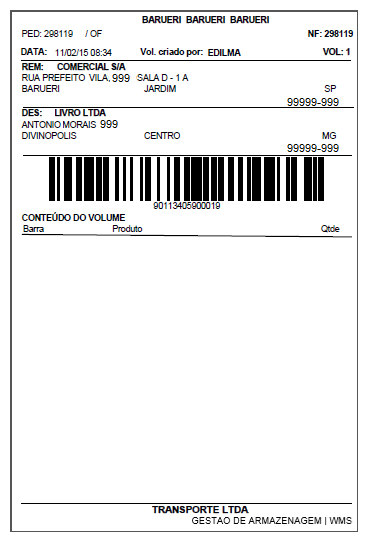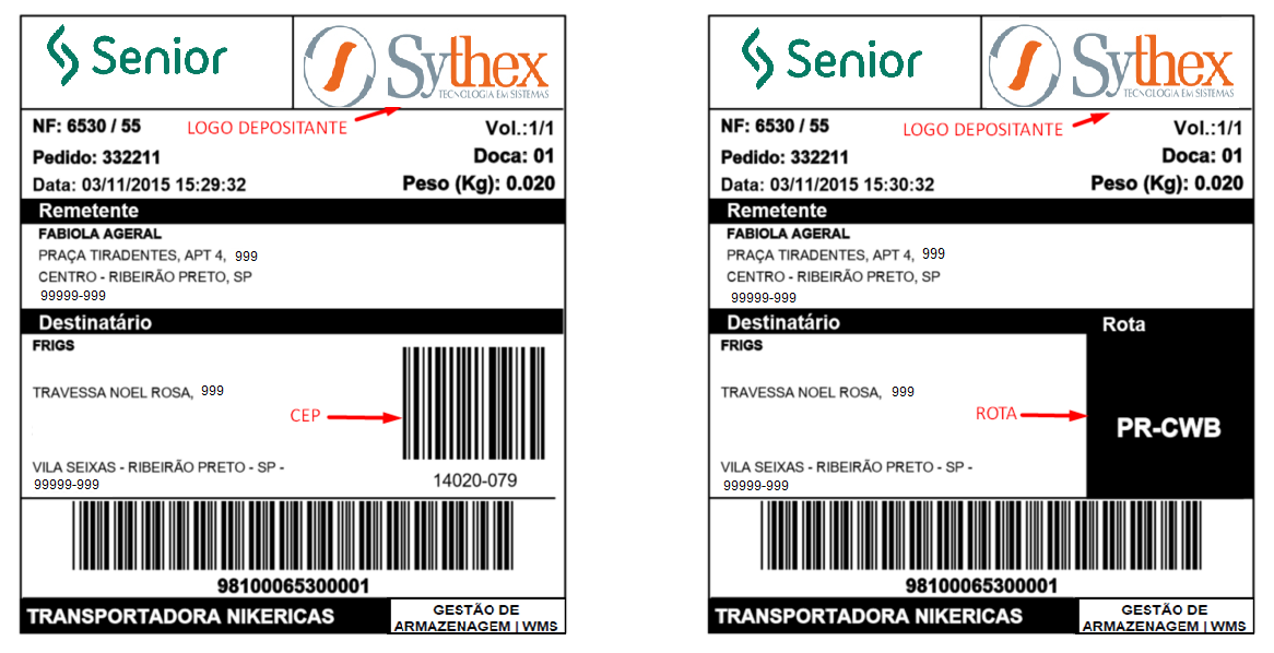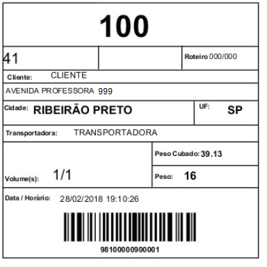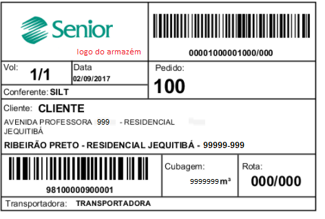 - Sin volumen de contenido con el logotipo del depósito / depósito: etiqueta con dimensiones 118 mm alto X ancho 108 mm: etiqueta creada a partir de la versión 7.8.0.0, busque elPronto en la pantalla Registro de entidad (Tipo: Depositante) e imprima el código postal, pero si ha registrado Ruta, en la pantallaCódigo de ruta a CEP, imprime la Ruta. Opción insertada desde las versiones 8.0.1.3, 8.1.0.5, 8.2.0.2, 8.3.0.1 y 8.4.0.0, pero solo se muestra en el menú si el parámetroUtiliza código de trazabilidadno está chequeado.
