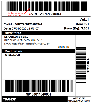 - Etiqueta de trazabilidad con servicio de devolución del proveedor: etiqueta con dimensiones alto 119 mm x ancho 109 mm. Insertado desde la versión 8.11.26.0 y 8.11.23.6, contiene la información deCódigo de barras para el servicio de portador, y que permite al usuario escanear el Llave de acceso. Ver más detalles.