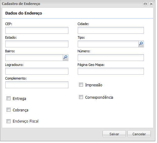 Tenemos la posibilidad de informar una o más direcciones de la entidad registrada, donde sus campos fueron listados desde el menú Registro / Datos Geográficos, es decir, en los menús Barrio, CEP, Ciudad, Estado, País y Región.