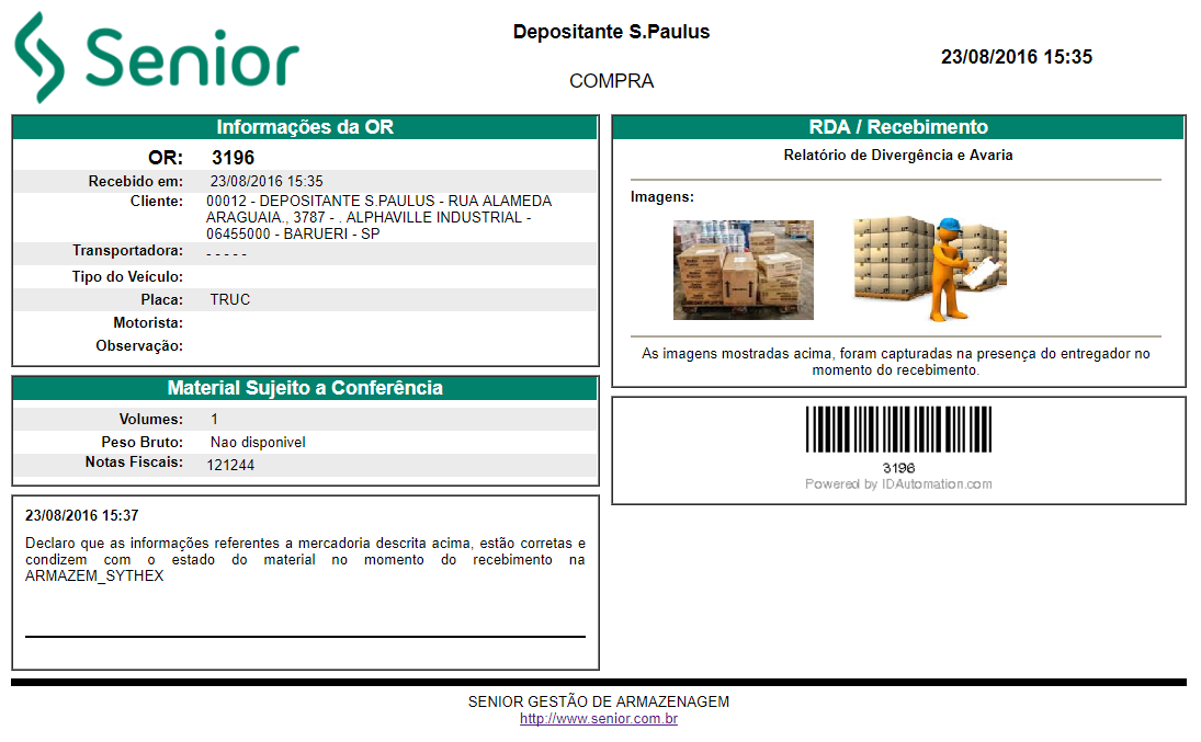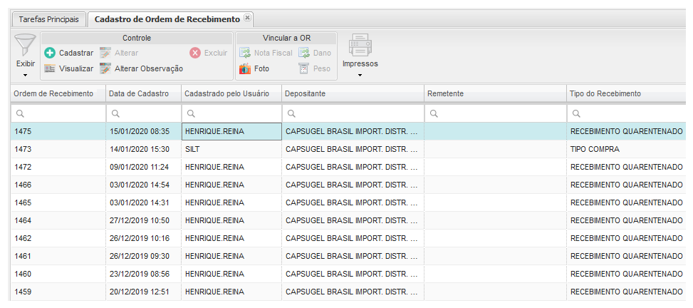 Es posible registrar un OR, relativo al Depositante, el Tipo de Recibo, qué Muelle donde se descargan las mercancías, cuál es el porteador, cuál es el vehículo: camión, remolque, por ejemplo.