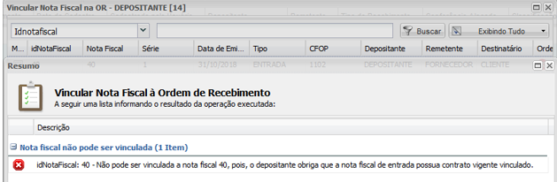 A partir de la versión 7.0.0.0, se agregaron validaciones de BackList al vincular NF a OR, que comienza en el parámetro Depositor Register /Utiliza lista de fondo se fuediferente enNo, se comprueba si elnota fiscal en cuestión es con el campoBackList validado definido comosí en el Registro BackList, y si también el OR no Tiene notas vinculadas, como para los depositantes que Usar BackList, solo se permite vincularun factura por OR y solo Facturas con el BackList validado , es decir, si el Registro de Depositantes escapaz El parámetro Utiliza lista de fondo igual quecontenido diferente en No , y si el archivo de la factura de entrada contiene el campo BackList validado definido como sí, el sistema permite la vinculación a OR solo una factura.