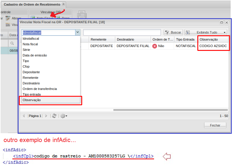 - Con la integración vía XML, el sistema lee los campos XML y genera la Factura, una de las Etiquetas XML contiene laInfoAdic, que se encarga de almacenar la información adicional de la nota. En este campo, el cliente recibe la información que está representada por elCódigo de rastreo, enviado por el depositante y que también está representado por el campoObservación , y que facilita el filtrado de notas para el proceso de Recepción.
