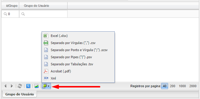 - Activar exportaciones a través de pestañas del sistema: activa el botónexportar ubicado en el pie de página de la cuadrícula, como se ve en la imagen de abajo.