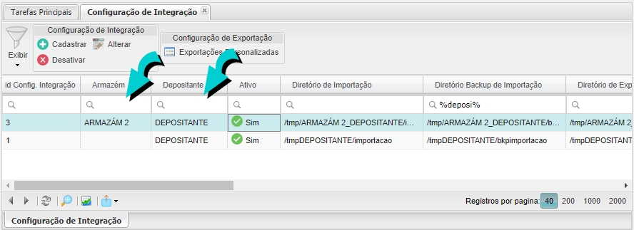 - Al realizar una configuración de exportación personalizada, en el momento de la exportación, el sistema filtra el ID del depositante y el Storeid de la configuración de integración definida. Además, es obligatorio que al crear la consulta también se informe cuál es el idDepositador y el idArmazem. De lo contrario, la exportación no se lleva a cabo.