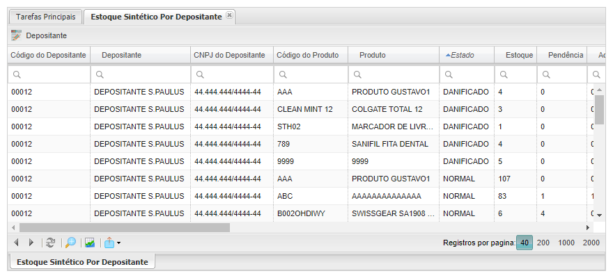Esta pantalla enumera los Depositantes y sus Productos, separados por Estado (Normal, Dañado, Truncado, Vencido), con sus diversos tipos de cantidades en stock, pendientes,sin la distinción de embalaje.
