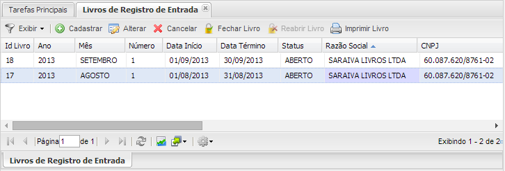 Esta pantalla contiene los botones: Ver con la posibilidad de seleccionar registros Abiertos, Cerrados y / o Cancelados, los botones Registrar, Cambiar y Cancelar, Cerrar Libro, Reabrir Libro e Imprimir Libro.
