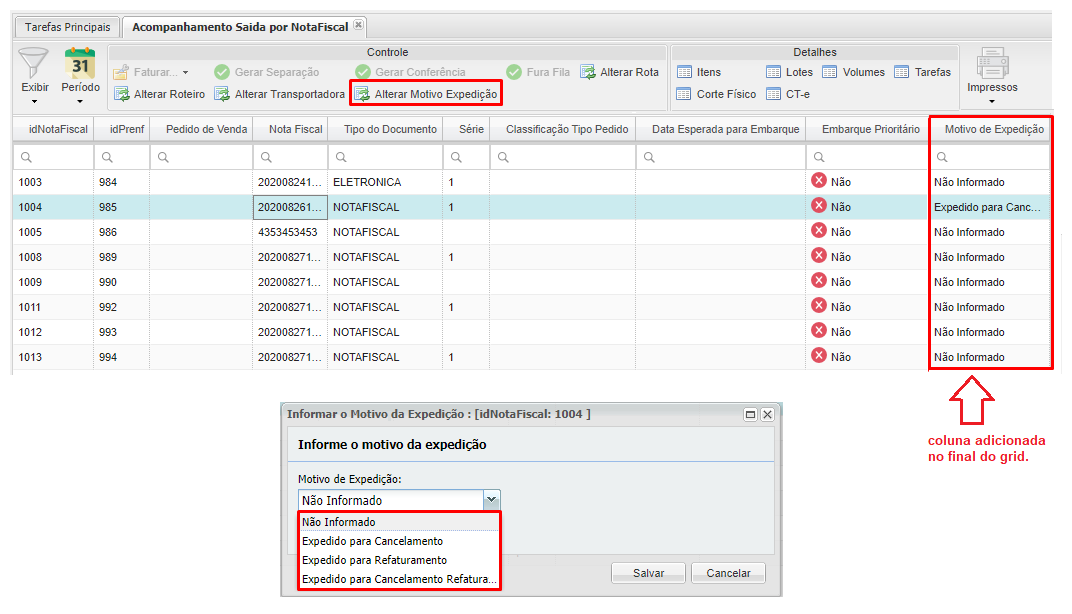 Después de cambiar de transportista a través de esta pantalla, y si la devolución generada por Gestión de Almacenamiento | WMS Senior en la pantalla de NF-e Control aún no estáautorizado, se generará un nuevo XML para enviar a SEFAZ con los nuevos datos del transportista informado. Esta funcionalidad fue desarrollada para que no sea necesario cancelar la ola si el transportista del pedido no coincide con el método de envío informado en la nota. Ajuste realizado en la versión 8.12.6.0. (Refiriéndose a WMS-11446)