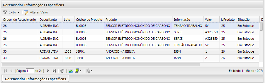 La cuadrícula de la pantalla del Administrador de información específica tiene el botónMonitor que muestra los filtros de la columna Situación que muestra los registros: Todo, En stock o Enviado y con el botón Cambiar valor.