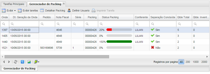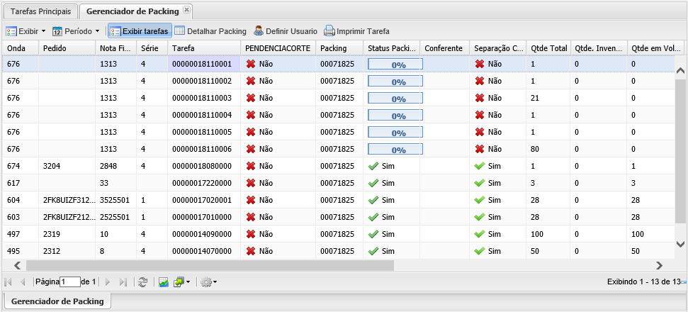 Esta pantalla muestra todos los bancos de Embalaje, estado de ejecución, estado de finalización, cantidad recibida, cantidad contada, informando la Orden / Factura a la que pertenecen los productos.