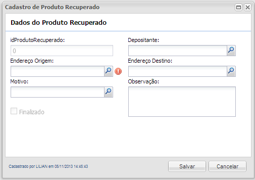 Menú: Movimiento> Lote> Devolución de producto recuperado