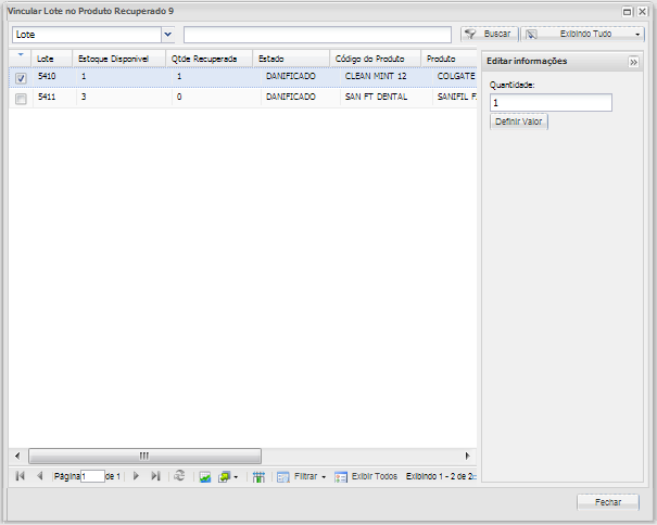 Muestra ventana para vincular Lotes con la cantidad de paquetes, activando el primer campo, el lote se asocia a Devolución de Producto Recuperado.