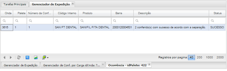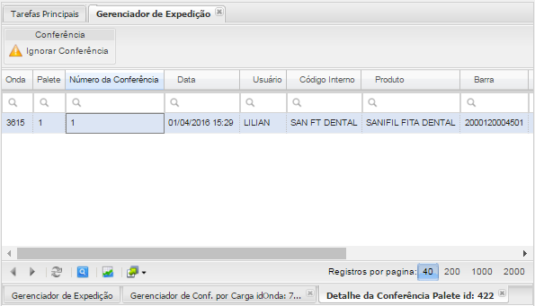 Muestra las ocurrencias de las conferencias realizadas, listando en la cuadrícula los datos de Wave, Pallet, Número de conferencia, Producto, Barra, Descripción y Estado.