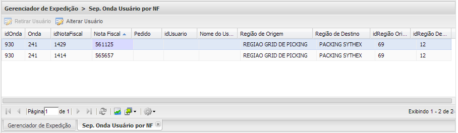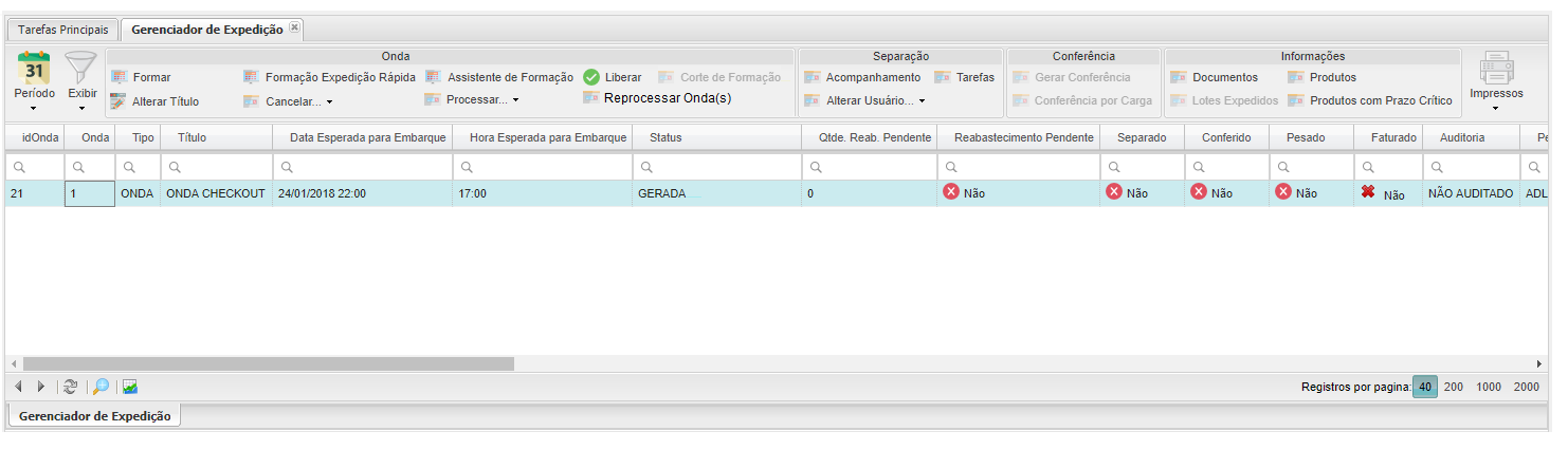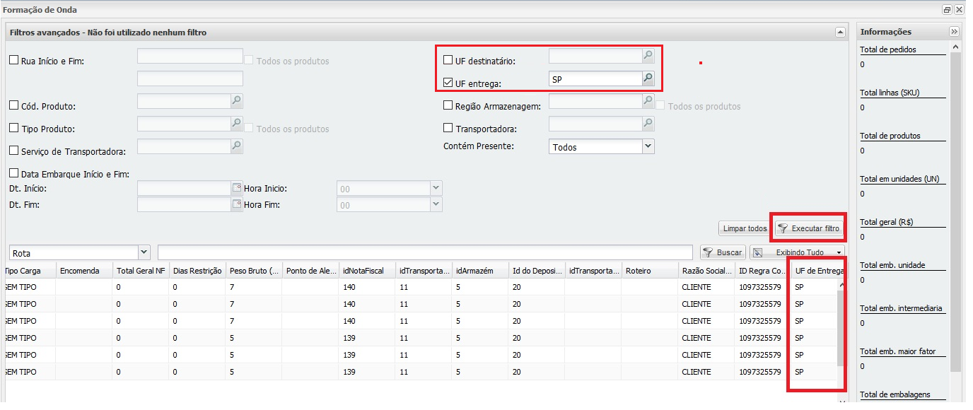 A partir de la versión 8.4.0.0, el sistema se adaptó ano permitir la selección de notas diferentes, con referencia a la primera factura seleccionada, si la configuración de la fase está parametrizada con la orden del club de compras y para las ondas cuando se parametriza aComprar orden de club Los pedidos se separan y controlan juntos. Con esto, el proceso de formación de ondas está destinado únicamente auna paleta. Si se produce la formación de más de un palet, muestra un mensaje de advertencia “No se pudo formar la ola, verifique el cubicaje del palet para el vehículo seleccionado”.