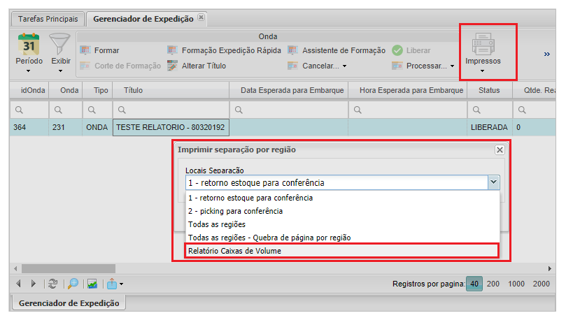 - Menú: Mover> Salida> Administrador de despacho> Botón: Impresiones> Mapa de separación> Informe de cajas de volumen.