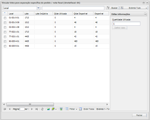 A partir de la versión 7.1.0.0, al realizar el proceso de vinculación de lotes en separación específica a pedidos para enrutamiento, presente en el menú Movimiento / Salida / Liberar Factura para Envío, el sistema realiza la asociación de lotes que deben separarse para cumplir con las cantidades. solicitado para cada producto presente en el pedido. Actualmente, la pantalla de enlace muestra los lotes que tienen cantidad disponible para asociarse con el picking específico del pedido. El cambio fue para permitir que la cantidad total vinculada esté dentro del porcentaje de tolerancia, es decir, la cantidad total de lotes debe usarse siempre que respete la tolerancia.