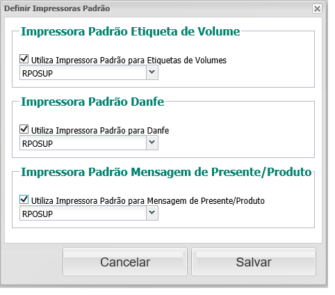 Pantalla de definición de impresoras predeterminadas: las impresoras predeterminadas del sistema están configuradas. Botón ubicado en el lado derecho en la esquina inferior.