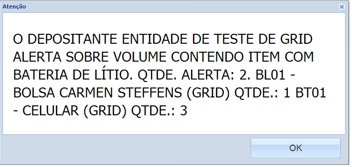 Desde la versión 8.7.0.0, la lógica deAlerta de litio se modificó, donde el sistema resume el Litio contenido en cada volumen, es decir, la suma es producto por producto, donde primero se considera la cantidad en unidad del producto dentro del volumen y luego se multiplica por el Factor de Litio. La suma muestra cuánto litio tiene el volumen y activa una alerta cuandoexceder al valor informado en el parámetro “Cant. Alerta. de Litio en Volumen ”en el Registro de Depositantes, es decir, hubo un cambio en la alerta en la cantidad de litio en el producto, en relación a la cantidad máxima permitida por el depositante, donde:O cálculo é: (quantidade do produto * fator da embalagem) * fator de lítio.