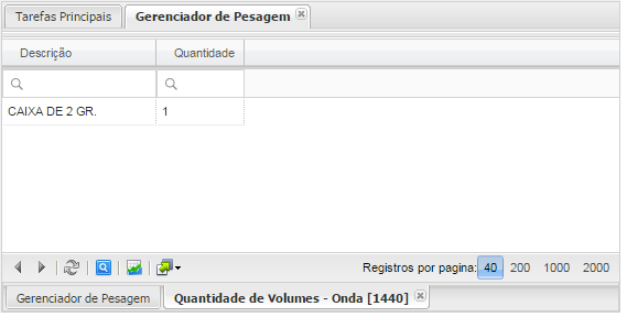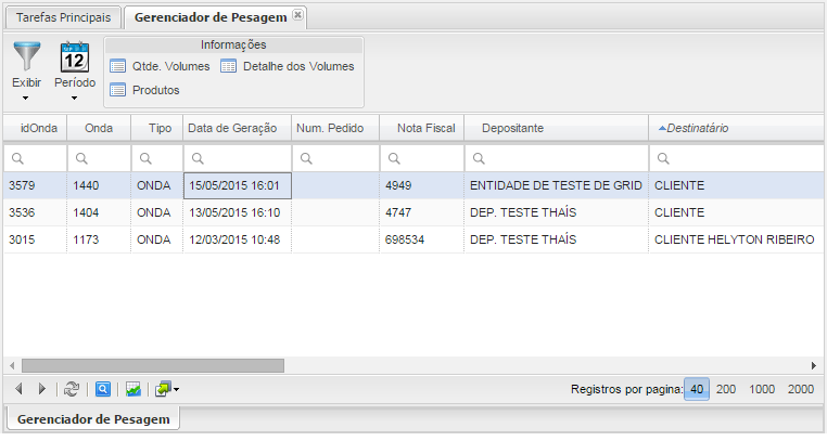 La cuadrícula de la pantalla Weighing Manager tiene el botón Mostrar que muestra la columna Estado para filtrar por los registros "No liberado" o "Liberado" y los botones: Volúmenes, Productos y Detalles de volumen.