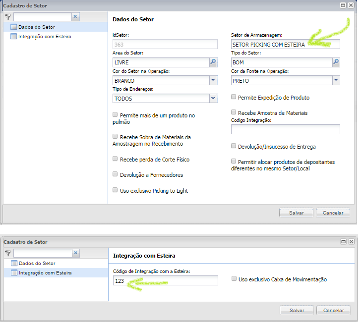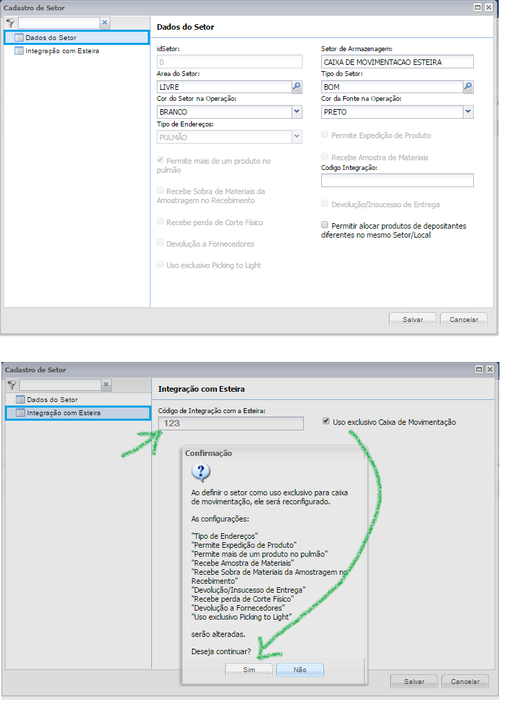 Al final de la ejecución de la reubicación de origen, se evalúa si la dirección de destino tiene el sector configurado para integración con cinta transportadora. Si es cierto, el sistema activa la integración con el transportador. Esta integración se encarga de determinar qué brazo de la correa dirige el producto a su respectivo picking.