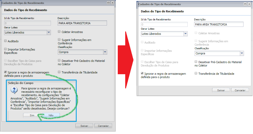 Para ignorar la regla de almacenamiento, es necesario reconfigurar el tipo de recibo, deshabilitando la siguiente configuración:
