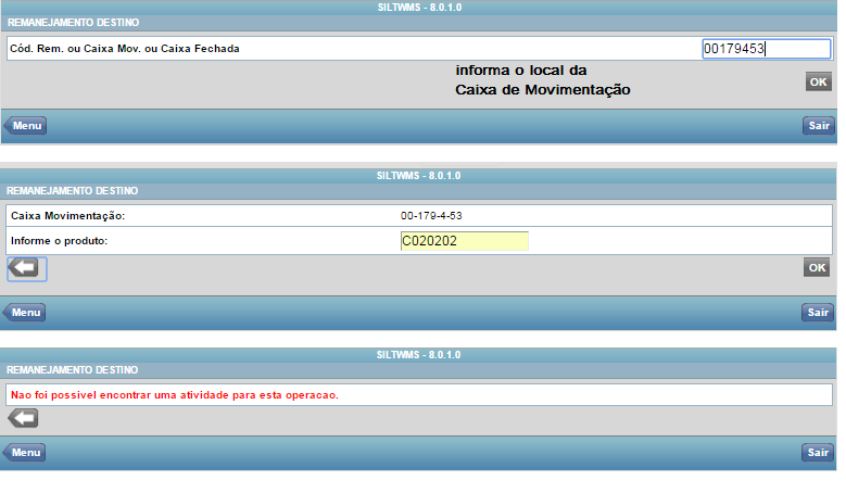 - Después de eso, el sistema solicita el producto. Al informar el producto, el sistema busca, en las reubicaciones que se originan en la caja de mudanza, a alguien que trabaje con este producto. Si lo encuentra, el sistema utiliza esta reubicación para seguir el proceso.