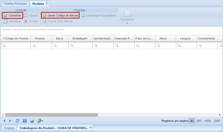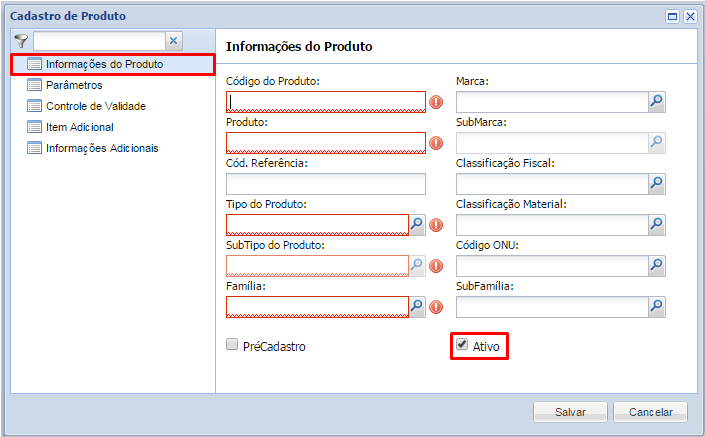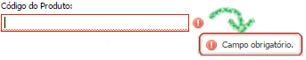 l sistema muestra la imagen de exclamación delante de algunos campos, es decir, en el ejemplo: el sistema requiere la cumplimentación del campo Código de Producto, informando que es obligatorio. .