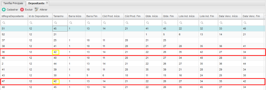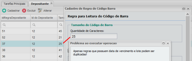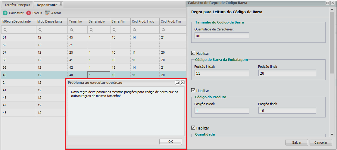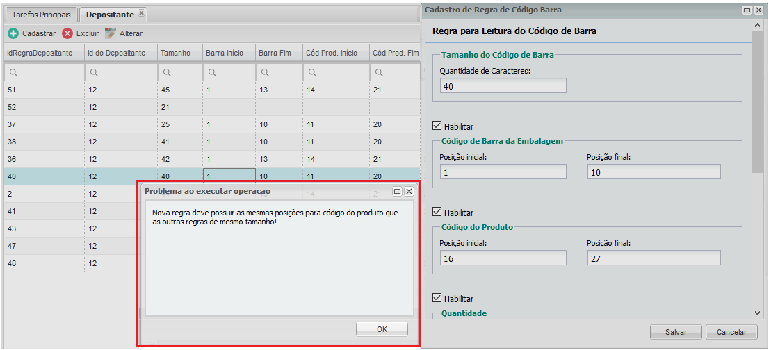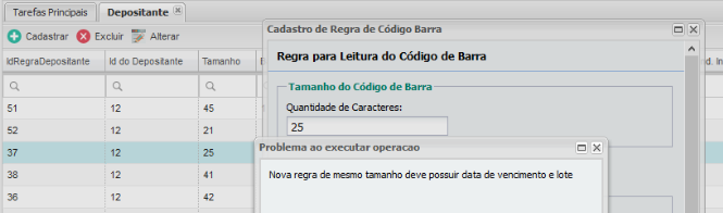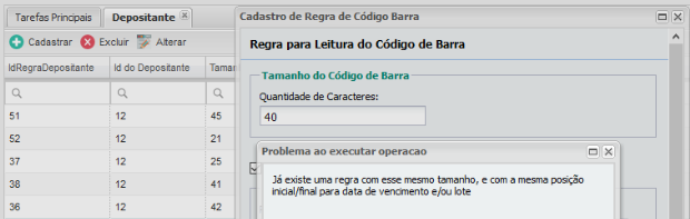 A partir de las versiones 8.11.5.131 y wms-5146, cambiamos la rutina de la regla de código de barras del depositante para permitir el registro.de más de una regla con el mismo tamaño.