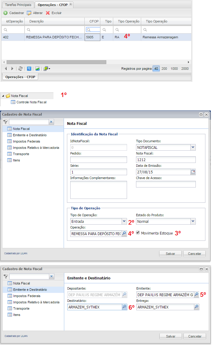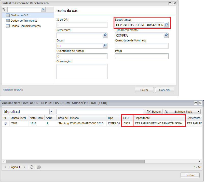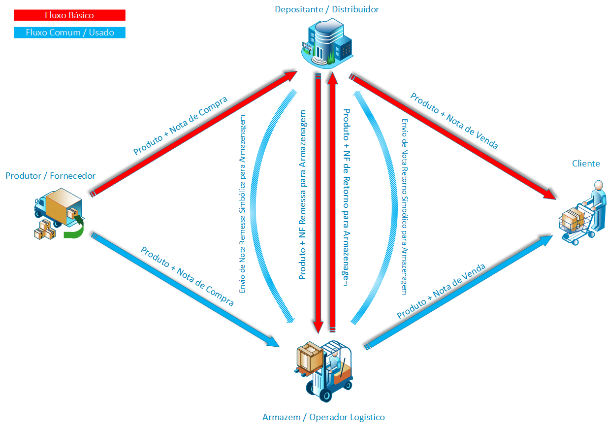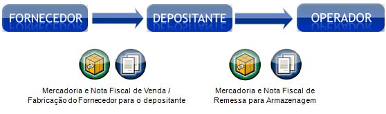 Los productos provienen físicamente del depositante, donde se produce el ingreso de materiales a través de un billete que mueve stock y es emitido por el depositante, para que ingresen cubiertos en el stock, es decir, el depositante envía los materiales al Operador Logístico (Almacén) acompañada de una factura emitida por el depositante, cuyo destinatario es el Operador Logístico (almacén). En esta operación, unCFOP específicos, con la naturaleza de operación compatible con el tipo de recibo (Envío de Almacenamiento, Envío para Consignación, Envío para Industrialización, Envío para Exposición, etc.).
