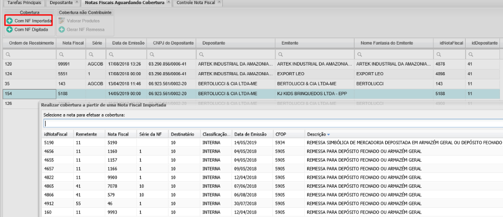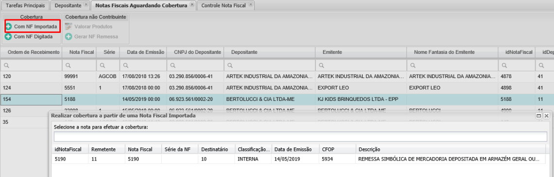 Con la configuración adecuada en el depositante, desde la pantallaFacturas en espera de cobertura y presione el botónCon factura importada, también es posible ver las facturas que fueron importadas con un CFOP de Envío a Almacenamiento, el WMS permite su uso para cubrir fiscalmente los materiales de la factura de A / P seleccionada.