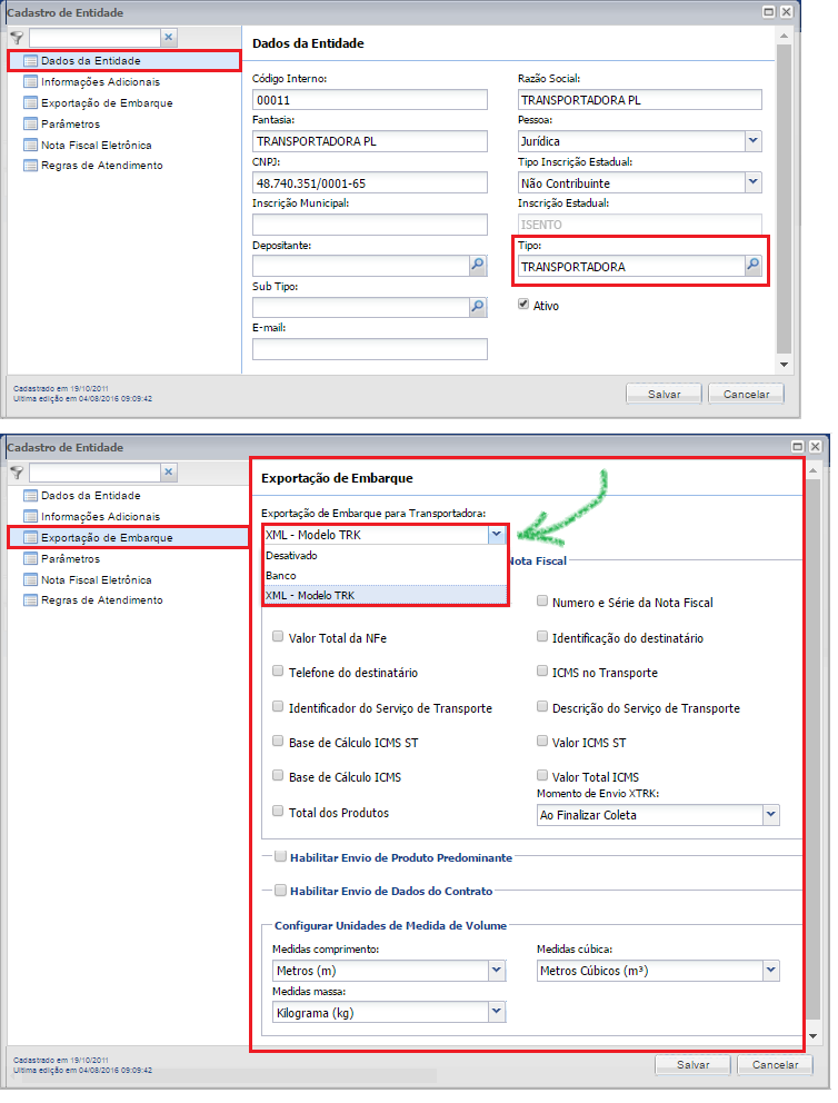 Inclusión de campoTiempo de envío de XTRK, en el Registro de entidades> Submenú: Exportación de envío, y controla cuándo se envía el archivoXTRK al Transportista, siempre que elTipo de entidad está Compañía de envios