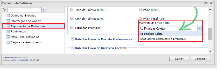 Es posible, a través del parámetroTiempo de envío de XTRK para el Transportista, establecido desde el registro de entidad / submenú: Exportación de envío, determine si el archivo ExportarXTRK y al
