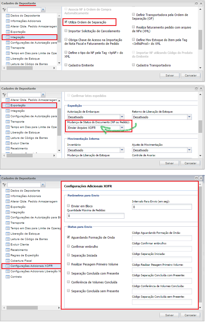 la opción "Enviar archivo XOFR“Se selecciona en el campo“ Cambio de estado del documento (NF u orden) ”. Observación:no se permite seleccionar la opción “Enviar archivoXOFR"cuando el depositante no utilice la orden de separación.