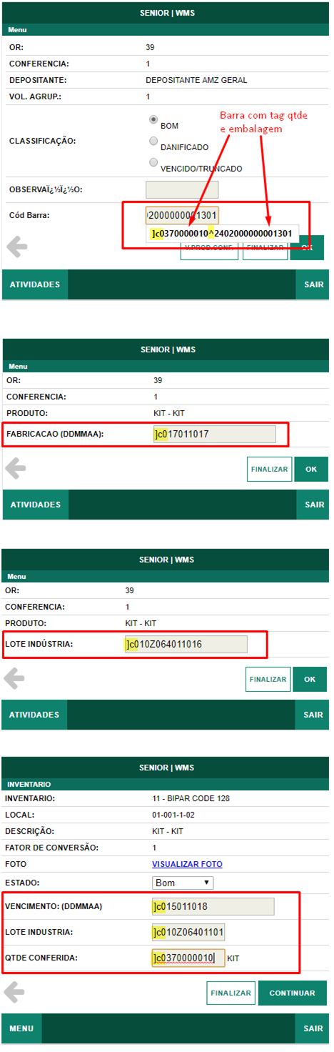 - 240: Identificador de producto (utilizado por Falcão antes de la implementación del Código-128) - tamaño variable de 1 a 30 + 3 del identificador