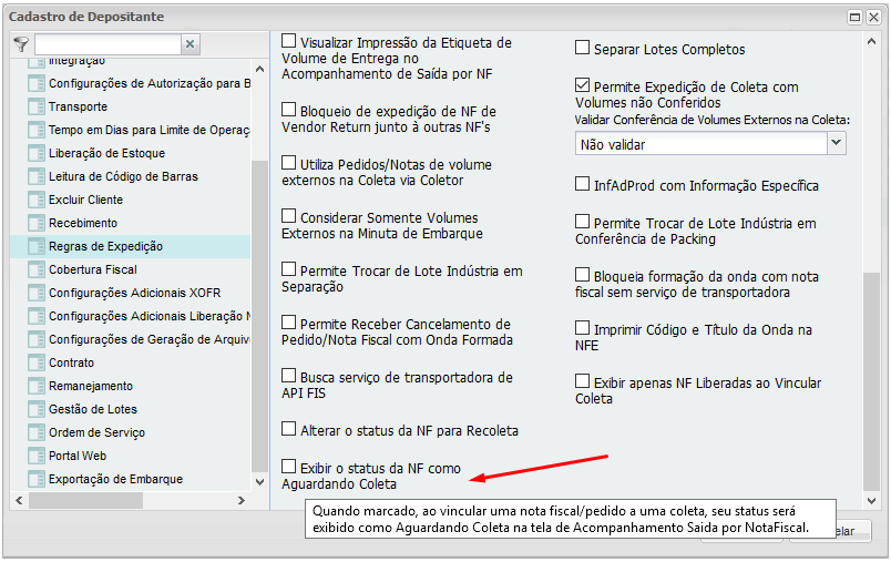 Agregamos el parámetroMostrar el estado de NF como En espera de colección en el registro del Depositante para controlar la nueva visualización de estado como:En espera de la Colección de la factura / pedido en la pantalla Salida por seguimiento de facturas:
