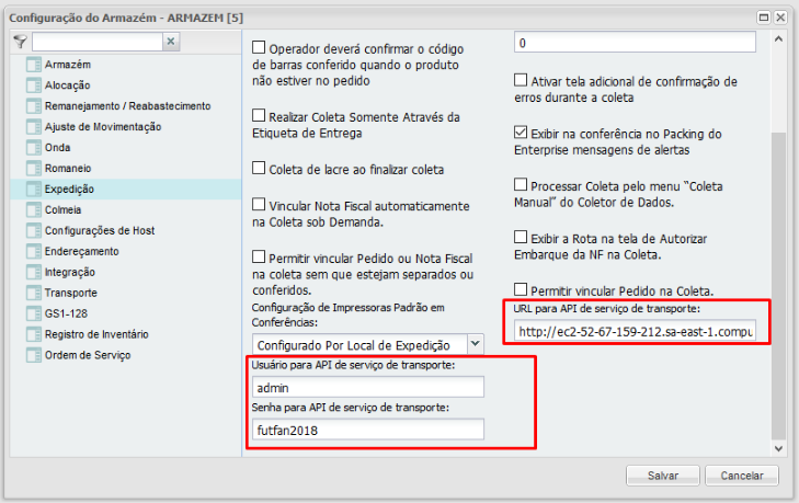 En la Configuración de Almacén adaptamos la dirección URL, usuario y contraseña para acceder a la API del servicio de transporte.